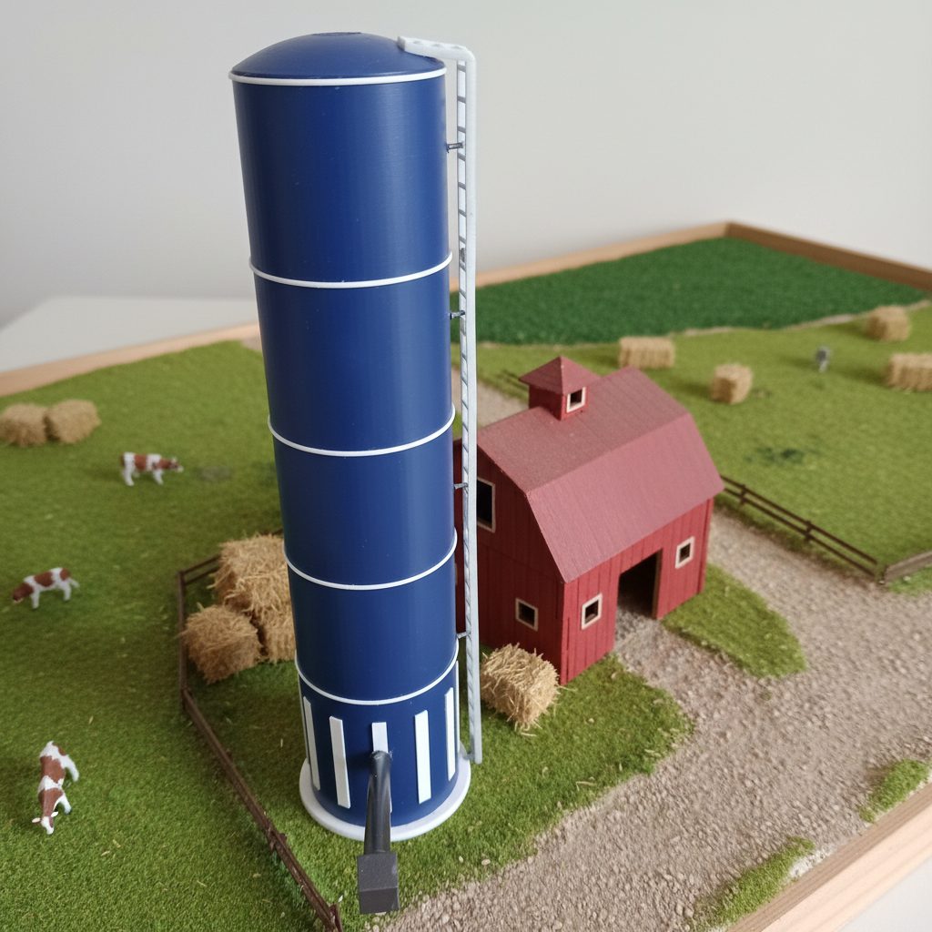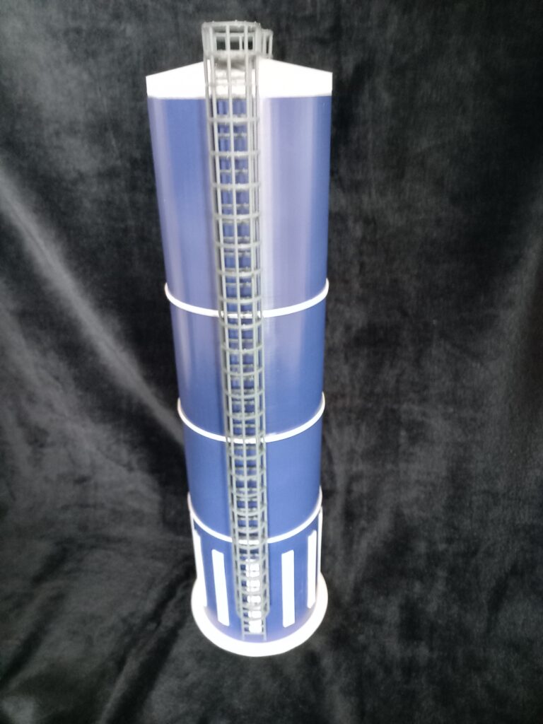 Réalisation d’un silo à grain pour un diorama. Ce silo a été réalisé en PLA et en résine, en plusieurs parties, d’une hauteur de 50 cm, avec un post-traitement et une peinture personnalisée.